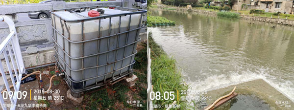 保興垾全水域共安裝固定點滴投放14處,均位于污水匯入量較大處,確保污水匯入時即有一定比例的RhP多功能水質(zhì)改良菌進入,快速削減污水中的污染物質(zhì)。