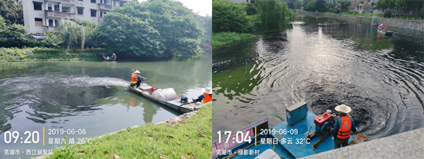 保興垾水域主河道和各支流實施方式和實施劑量均不相同,現(xiàn)場實施時,技術(shù)部門依據(jù)每日現(xiàn)場巡查結(jié)果和水質(zhì)自檢數(shù)據(jù),實時調(diào)整實施方式和實施劑量,力求達到最佳治理效果。