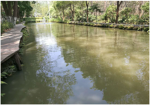 1號水域:位于焦姥路北,翠隱洞天東,長130米,均寬8米水域,面積1.62畝,1號水域相對獨立,補(bǔ)水由噴泉引地下水補(bǔ)充,水深1.5米,水體發(fā)黑,富營養(yǎng)化嚴(yán)重,透明度低;