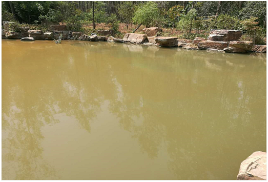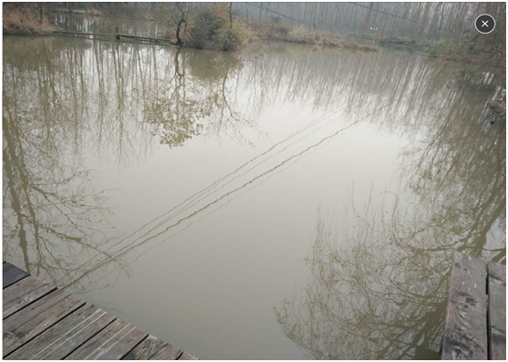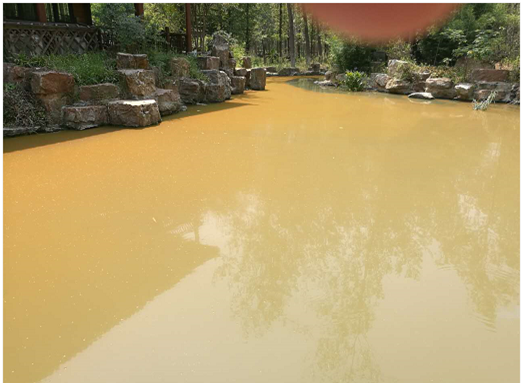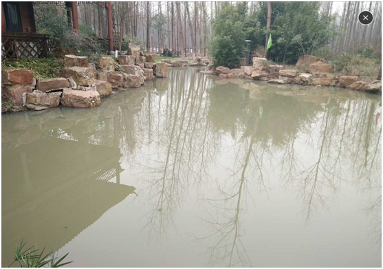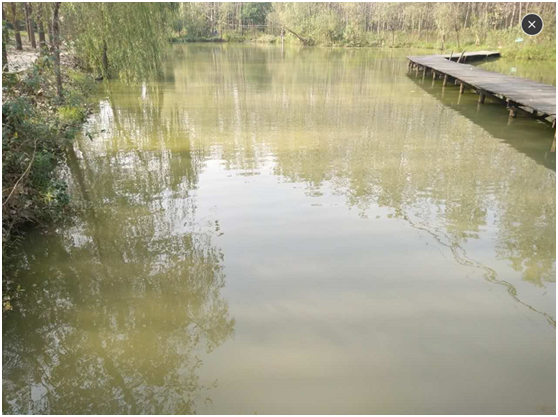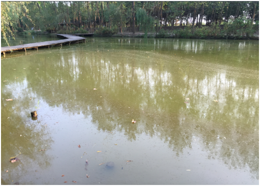 2號水域:位于茗舍聽見附近,水域相對獨立,面積0.84畝,水深1.5米,水面飄浮厚厚的藻類水華,水生態(tài)嚴(yán)重缺失,水色呈黃色,補(bǔ)水由地下水補(bǔ)充;