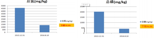 治理一年后,內(nèi)源污染大幅降低,底泥顏色由黑變灰,再變?yōu)橥咙S色,其中2015年12月31號---2016年8月10日8個月時間,底泥中總氮下降70.4%,總磷下降79.2%。